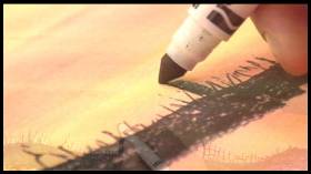 رسم الغروب بطريقة سهلة الخطوات نحضر الالوان المائية اللون الاصفر والاحمر نرسم خطوط مستقيمة كما بالشكل بعدين باللون الأصفر نملي الفراغات وندمج اللونين والان صارت الخلفية جاهزه ونرسم الاشكال اللى انتم عايزنها بالون الاسود على فكرة الموضوع منقول