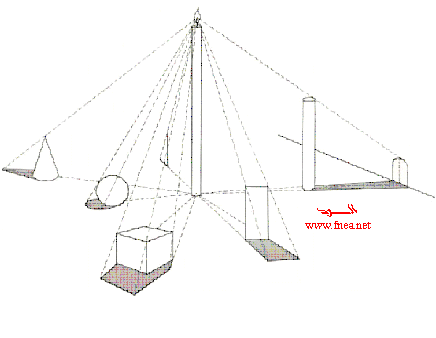 قمنا بوضع مجموعة من المسامير في أماكن مختلفة على سطح مستوي ولوناها باللون الأزرق وسلطنا عليها مصدر إضاءة واحد , ورسمنا خط وهمي من المصباح الى النقطة أ ثم رسمنا خط وهمي متقطع من النقطة أ إلى النقطة ب التي تمثل قاعدة المسمار وهذا الخط المتقطع سوف يبين اتجاه الظل , بعد ذلك رسمنا خطا أصفر يبين سقوط الضوء على المسمار الخط ج ,