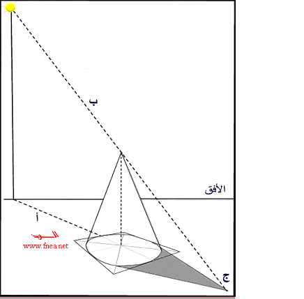 وكما تعلم فأن الشكل المخروطي لا يوجد به خطوط متوازية إذا سوف يقوم الخط الوهمي أ بالمرور من منتصف قاعدة الشكل المخروط التي هي عبارة عن دائرة عندما يلتقي الخطآن أ ب في النقطة ج تكون هذه النقطة هي رأس ظل المخروط .