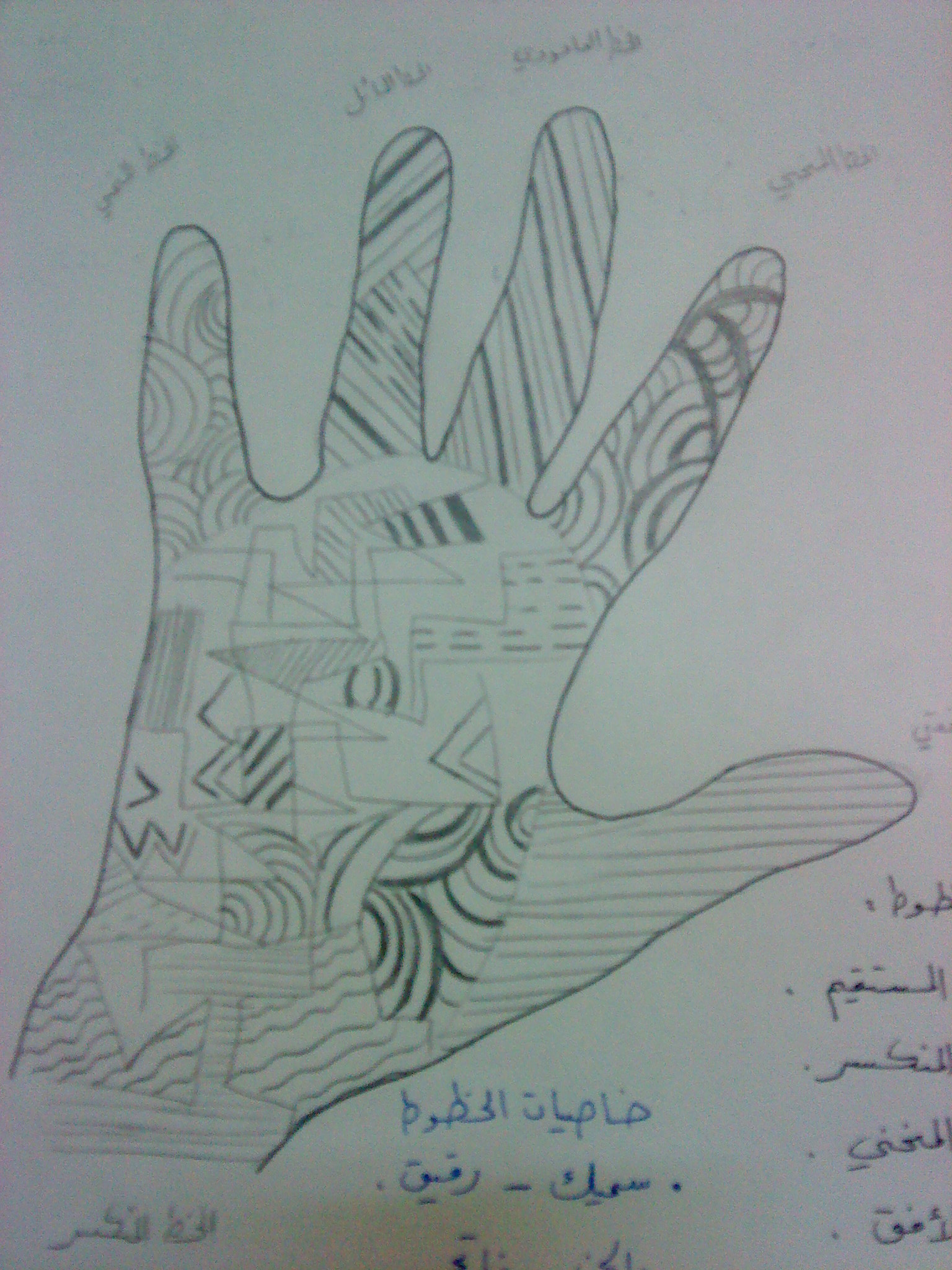 اختي العزيزة أسأل الله ان يوفقك في المقابلة اليوم يجب ان تتوقعي ان الطالبات قد لا يكون معهن ادوات حتى ولو كانت مدرسة خاصة .حاولت قدر الامكان ان اجمع لكي معلومات عن الدرس انا كان برأيي ان يكون الدرس كما يلي : ان تطلبي من الطلاب ان يضعو يدهم على الورقة ويمررو القلم من حولها لترسم على الورقة كما انا فعلت في الصورة او ربما تجعلينهم يرسمون اي شكل اخر و ستكون الخطوط محصورة فقط في هذا الشكل من اللوحة و تنبهي الطالبات الى ضرورة انهاء العمل في الحصة الدرسية نفسها و تحرصي على انهائهن للوحة و ربما استخدام الالوان في تشكيل الخطوط لا يهم فأنتي تريدين نتائج و تريدين ان يعمل كافة الطلاب دون استثناء يمكنهن استخدام المسطرة وذلك لرسم الخطوط المستقيمة و الخطوط الافقية و الخطوط المنحنية كلها بجانب بعضها منها الخطوط الثخينة و منها الخطوط المتقطعة في التمهيد للدرس قد تبدأي برسم بعض الخطوط على السبورة و تذكرين اسماء هذه الخطوط و تقولي قد نصاب احيانا بالملل و نمسك القلم و نرسم خطوطا عشوائية و هذه الخطوط قد لا تعني شيئا لكنها لو رتبناها بطريقة معينة قد تصنع في مجملها لوحة جميلة جدا اليوم سأعلملكم كيف يمكننا من هذه الخطوط العشوائية عمل لوحة ,ثم تخبرين الطالبات عن اللوحة و اهم مكوناتها من عناصر متوازنة مع بعضها و تلوين كافة اجزاء اللوحة انتهاء بخلفية اللوحة و يفضل ان تكون الوان الخلفية خفيفة لا تثير الانتباه الها و تشتت الناظر اليها عن الموضوع الاساسي . ثم تطلبين البدء برسم اليد و عند رسمهم لها تسألين هل انتهينا من رسم يدنا؟ و تطلبين رفع اللوحات لتري ان الكل قد قام بالعمل في هذه الحركة تكونين قد كسبتي شد انتباه جميع الطلاب و اللجنة التي تحضر الدرس لأن اللجنة ما يهمها بالدرس طريقة تعاملك مع الطلاب و حوارك معهم عند رؤيتك لكل اللوحات تطلبين البدء برسم خطوط و اشكال حرة بكافة اشكالها و انواعها ضمن مساحة اليد فقط ثم تسألين ماهو عنوان درس اليوم؟؟ فتجيب احدى الطالبات خطوط و اشكال حرة و تدونيه على السبورة فورا.