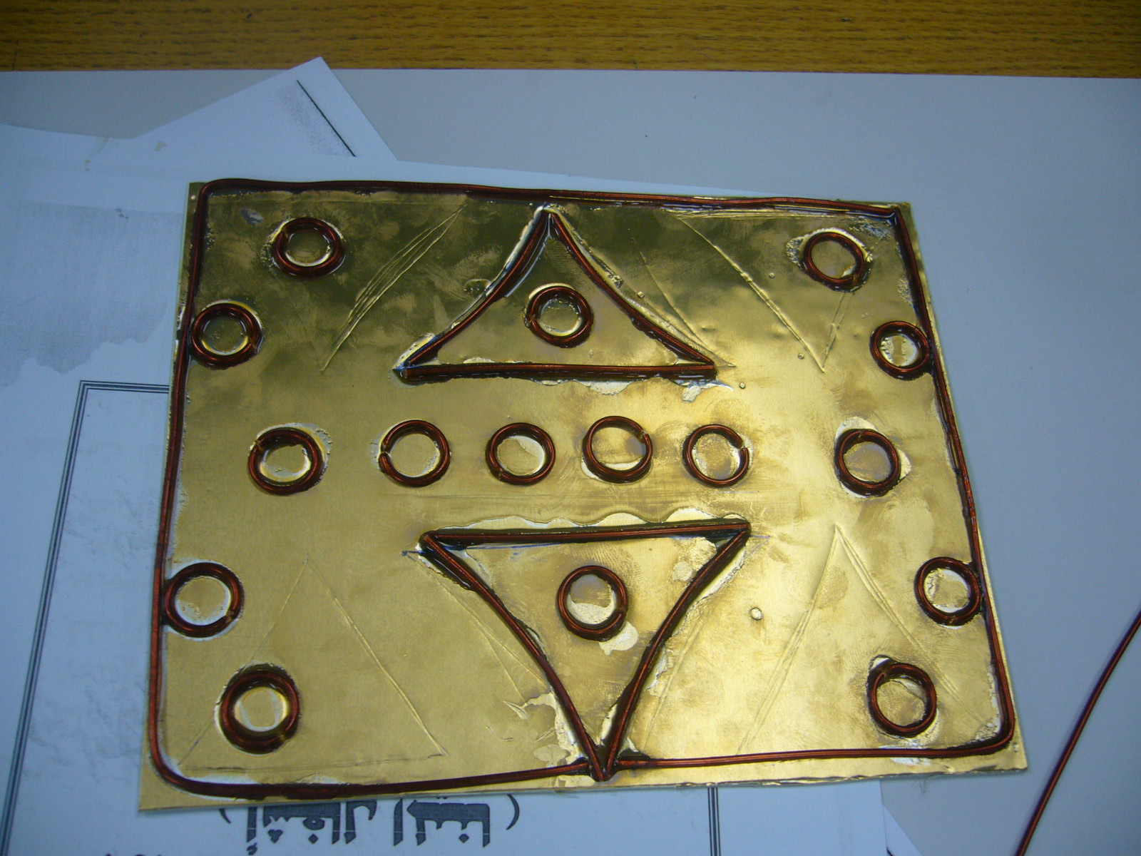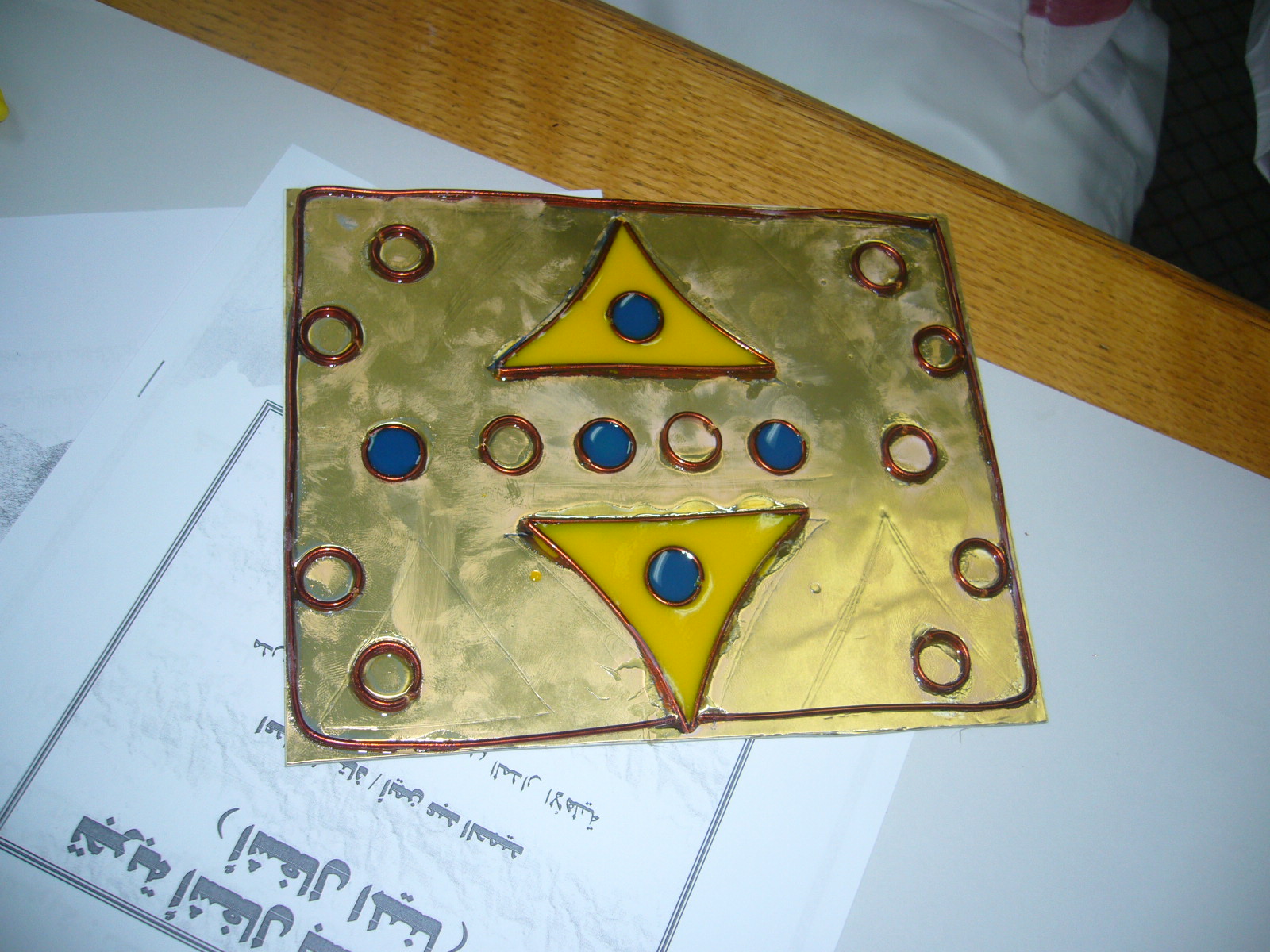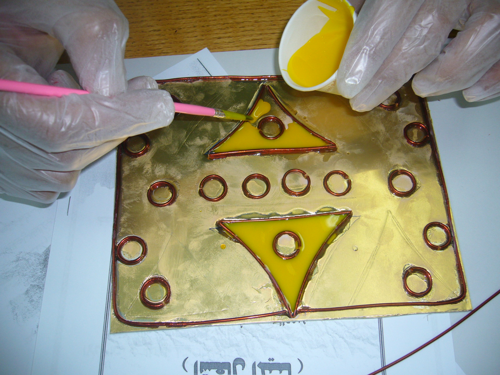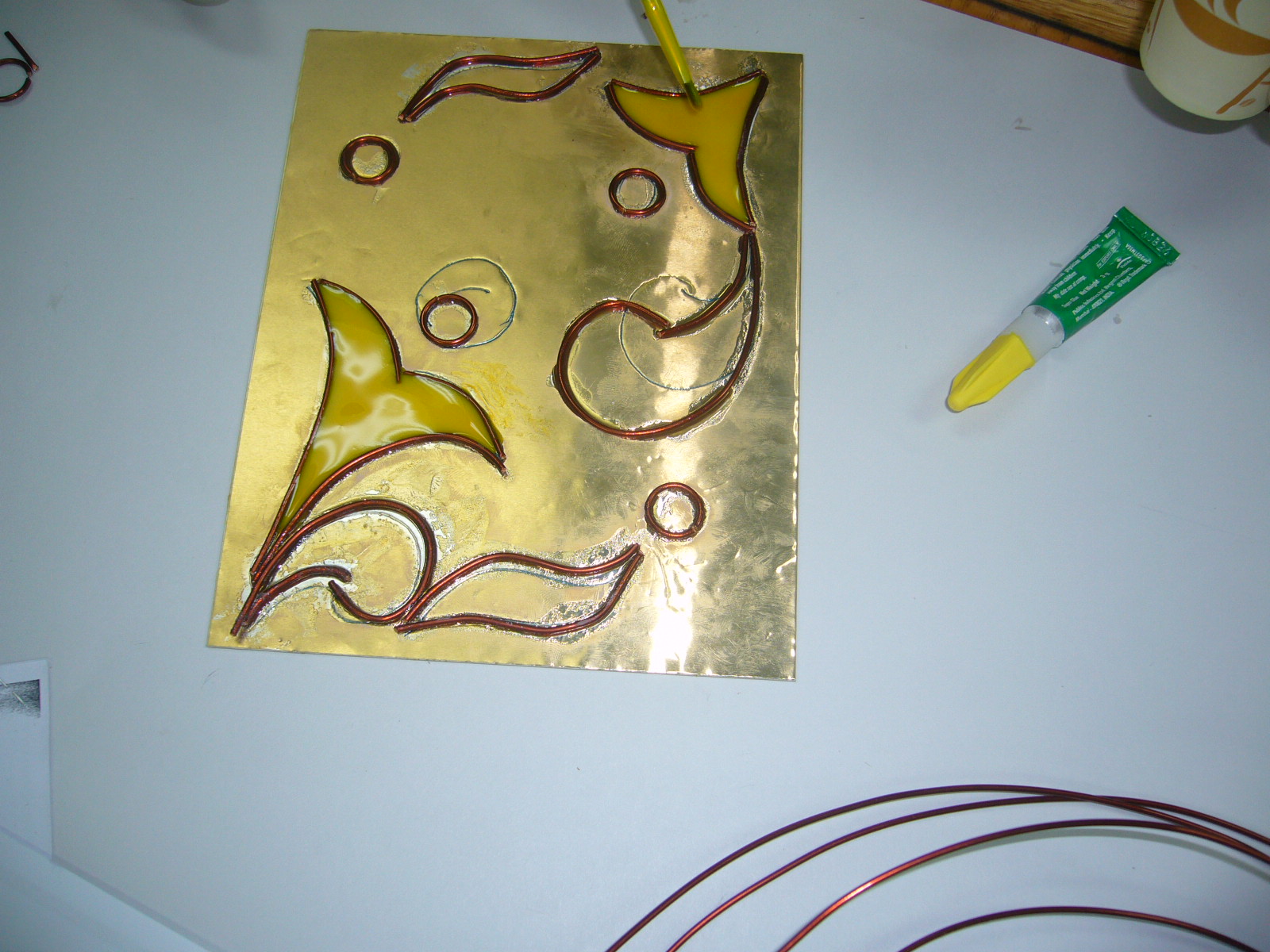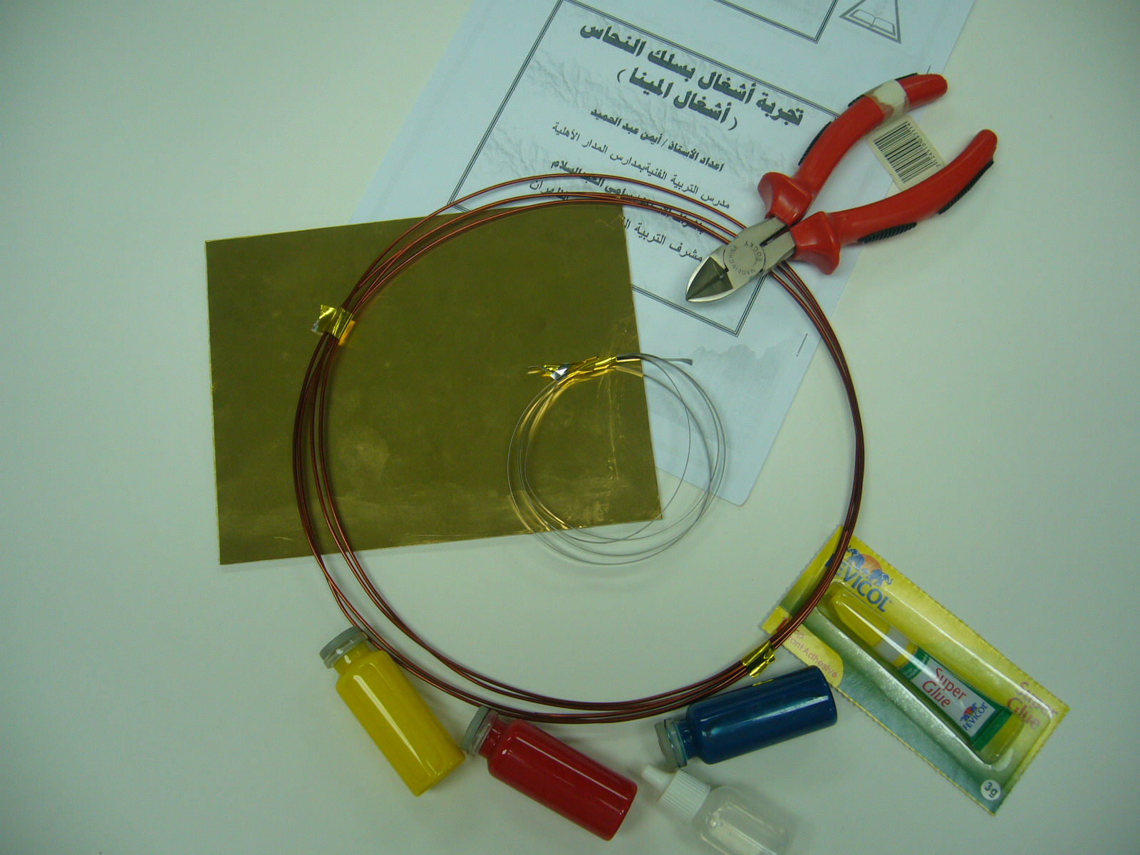 فكرة التجربة: تعتمد على تثبيت سلك النحاس على خلفية معدنية او المونيوم بلاصق قوي وملأ الفراغات بين السلك بخامة البوليستر الملون.