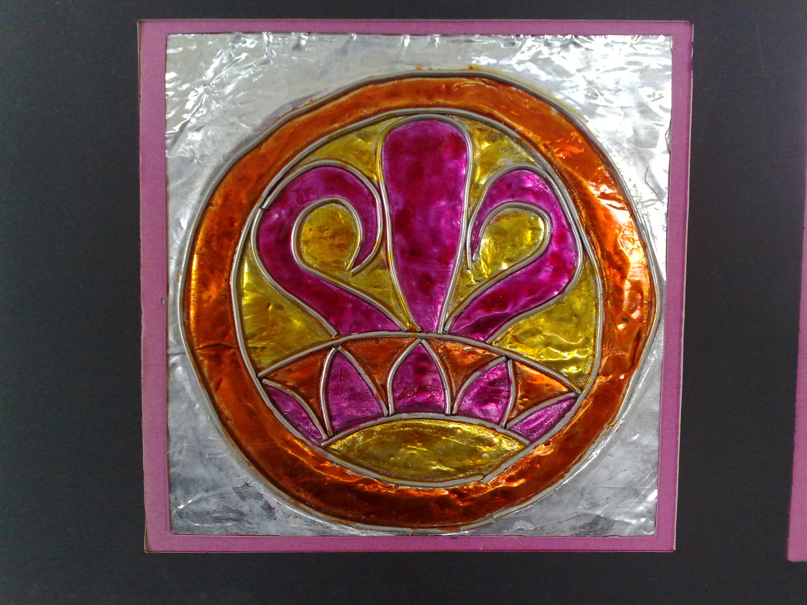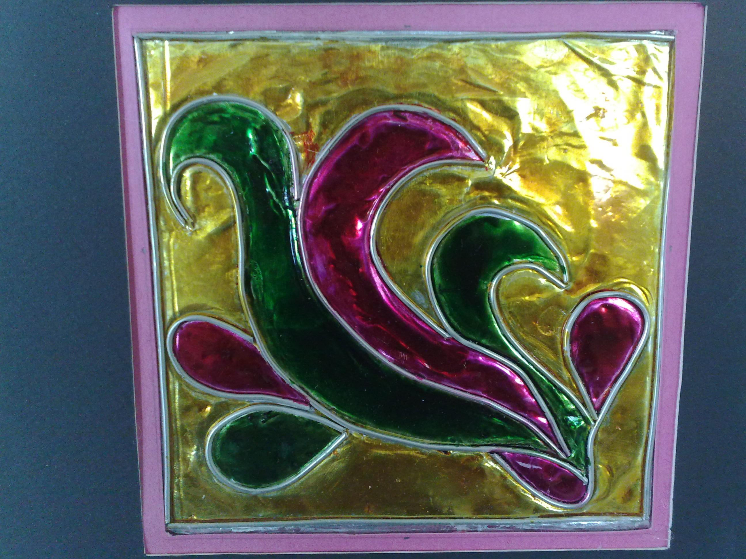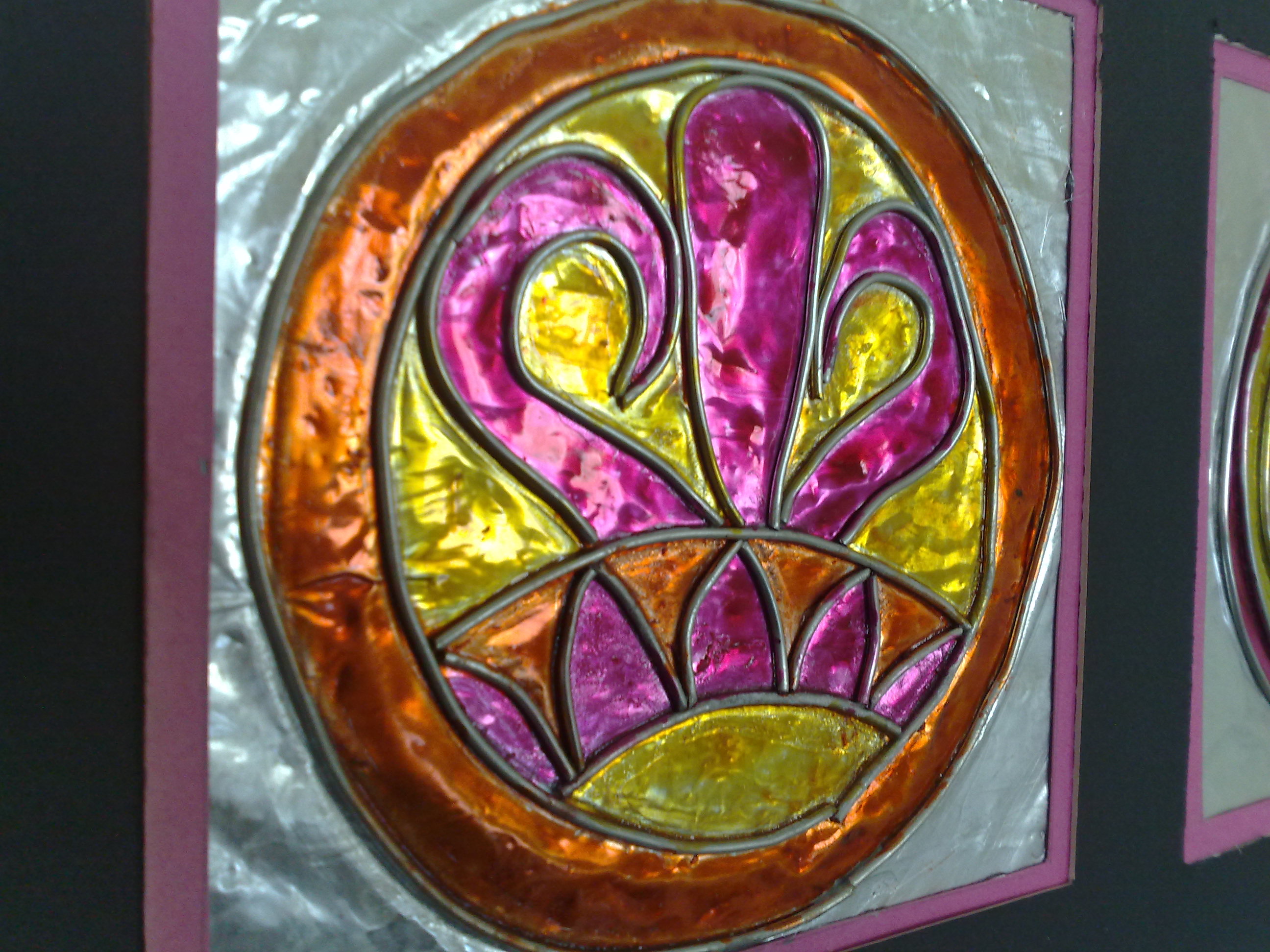 اولا رسم تصميم ونقله على معدن الايتان( معدن يباع في المكتبات بالمتر والتشكيل به متنوع ونتائجه رائعه)
