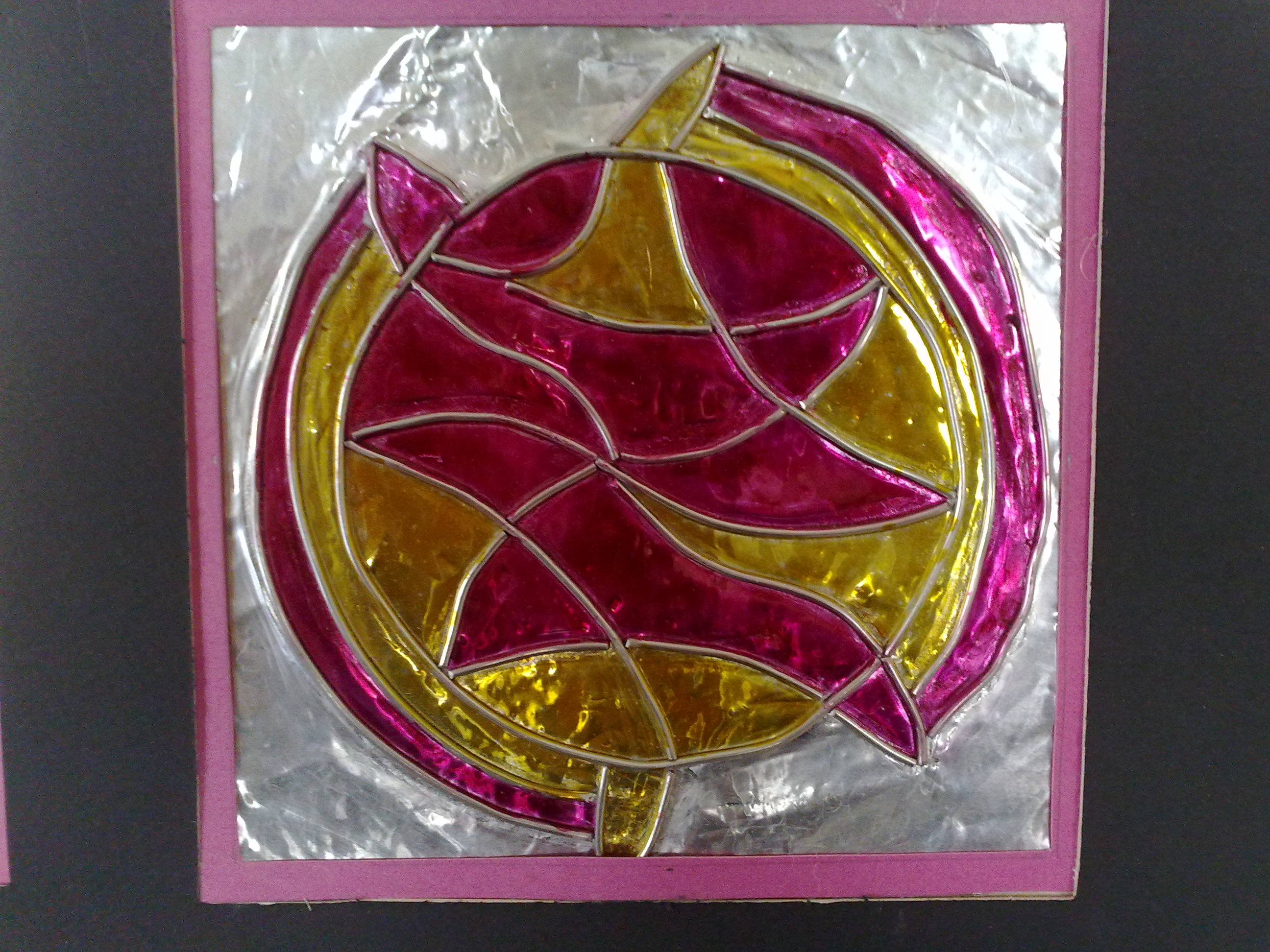 يقص السلك ويتم تشكيله بحسب التصميم ثم يلصق باللاصق الخاص بالزجاج( يباع في المكتبات والسوبرماركت ... اذا مو واضح كرتونته يجي معاها دبوس .. ان شاء الله عرفتوه)