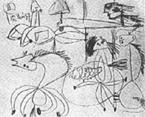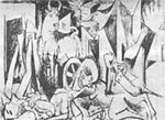 ولكي نتابع التطور الكامل الذي سار فيه العمل ينبغي أن نعود مع بيكاسو إلى التاسع من مايو، حيث كان يفكر في موضوعه بنوع من الانفعال الخالص، وأنه كان غير قادر تحت ضغط اللحظة الراهنة على تجنب شيء من المبالغة في