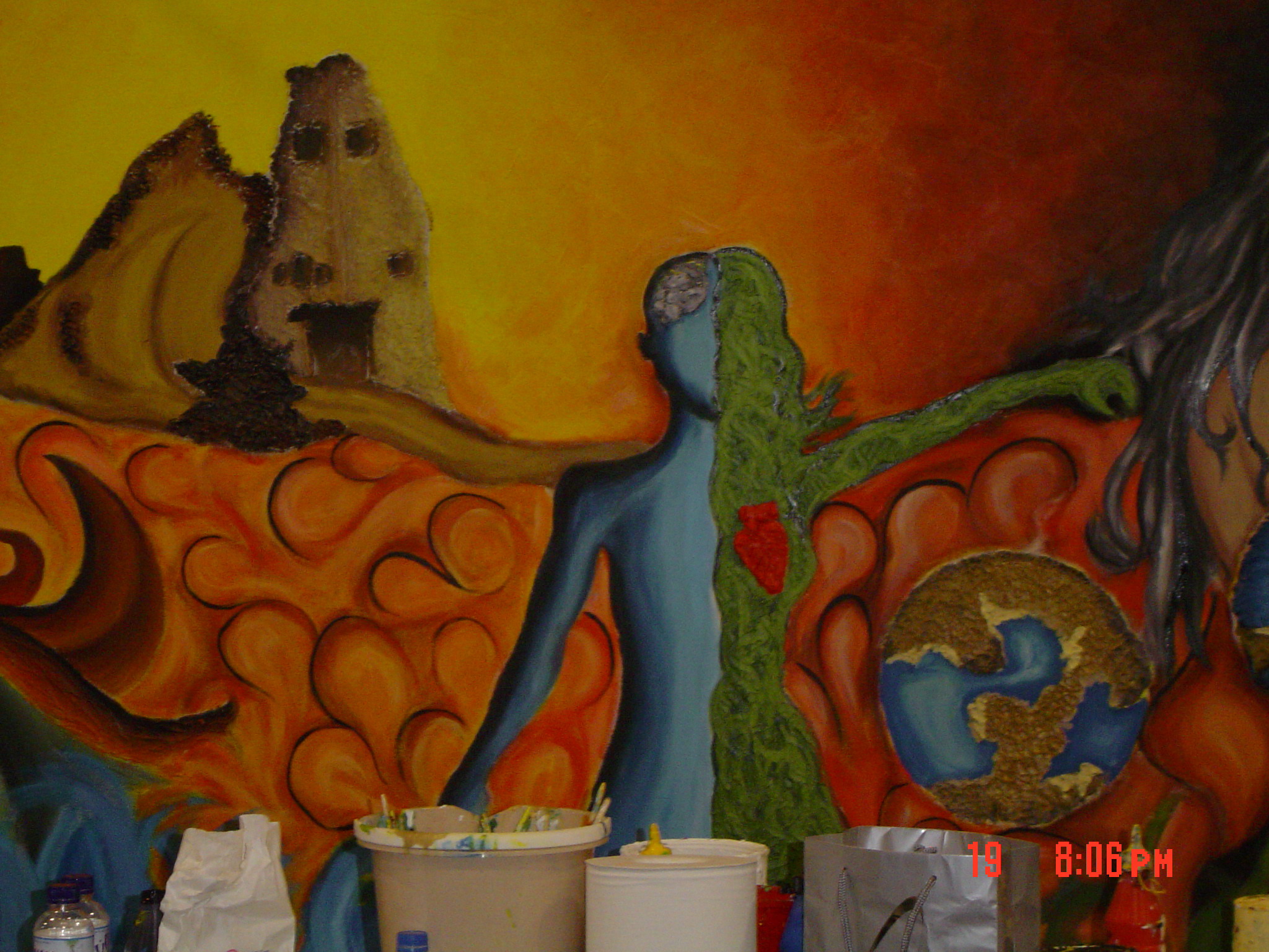 استخدام العجينة الجاهزة لإعطاء ملامس في العمل ،الرسم للطالبات أنفسهم طالبتان من الأول الأعدادي وطالبة