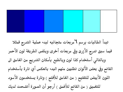 انا اعرف وش هو التدرج اللوني بس كيف اشرح لهم ابغي افكار من عندكم وخاصتا الي دارس فنون او هاوي الفن او مدرسات الفن . لا تردوني الدكتوره طالبه مني البرزنتيشن مع اعداد الوسائل والتحضير للدرس تاريخ 15_1 ارجوكم ساعدوني في اسرع وقت .