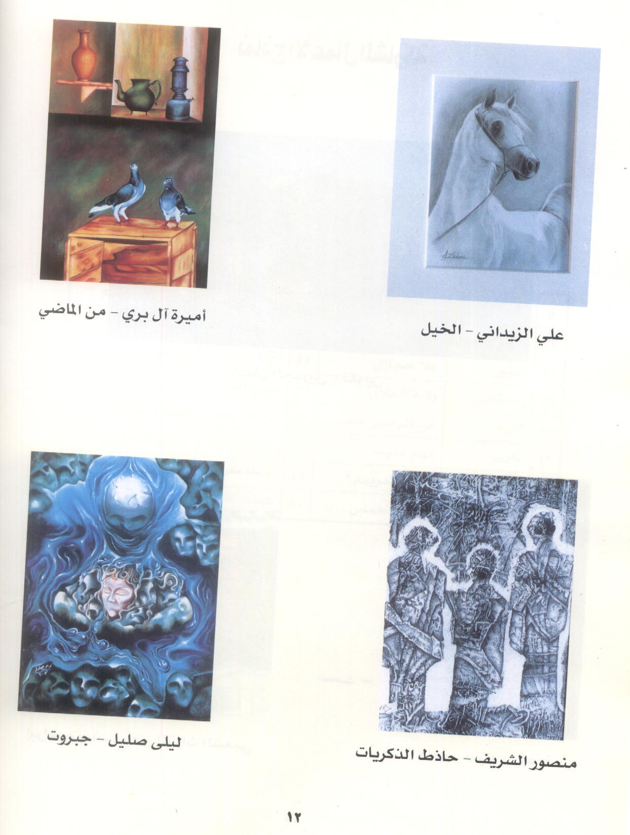 التشكيل النسائي إن جاز لي التعبير حضر بقوة من خلال تكوين علا حجازي المتميز، وتجريد وسمية العشيوي، وإبداعات خديجة مقدم، وأميرة الألحان لـ زهراء البناي، وأعمال بدرية الناصر بألوانها وطريقة أدائها المعروفة، وفوزية عبد اللطيف التي شاركت بعمل يصور فتاة تصب القهوة أسمته "من التراث"، وهدى العمر من خلال عملها التعبيري "آفة العصر" ،ورحلة صيد لـ رقية الحلال، وبحر الندى لـ أماني الدريهم، غير أن ليلى صليل قدمت عملاً سريالياً متميزاً صورت فيه رأساً متهشماً يخرج منه سائل أزرق اللون يشبه أرجل الإخطبوط ويتجه بنظره إلى الأسفل وكأنه يبث سمومه على وجه فتاة حزينة ظلت صامدة رغم النهاية المأساوية لمن حولها، هذا الوجه جعلته في وسط اللوحة كمركز للنظر بينما تحيط باللوحة مجموعة من الجماجم المتهالكة تسير نحو المركز وأخرى ترقب الحالة.