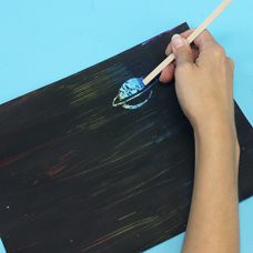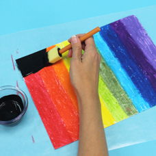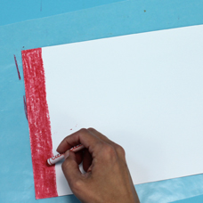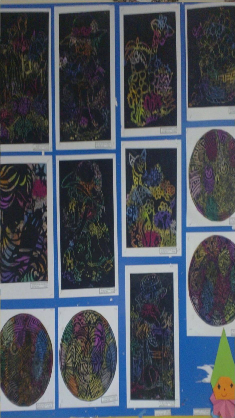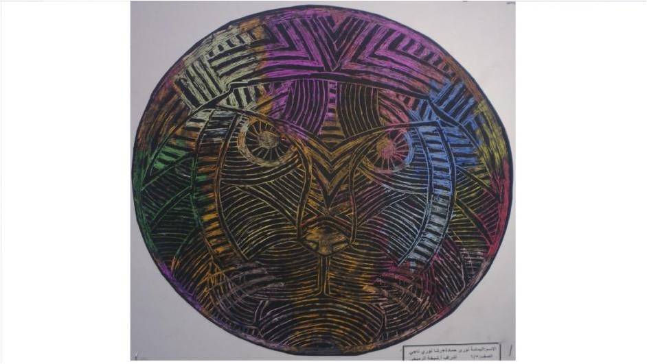 نلون الورق الابيض بالألوان الشمعية بطول الورقة أو نعمل دوائرأو مربعات أو نجوم في الورقة البيضة أي نملي الورقة من الوان الشمعية بعدذلك نضع عليها لون الشمع الاسود او في طريق ثانية وهي بالالوان الاكريلك انا عملة بالالوان الشمع وبعد ذلك اتي برسمة جاهزه واطبع فوقها .