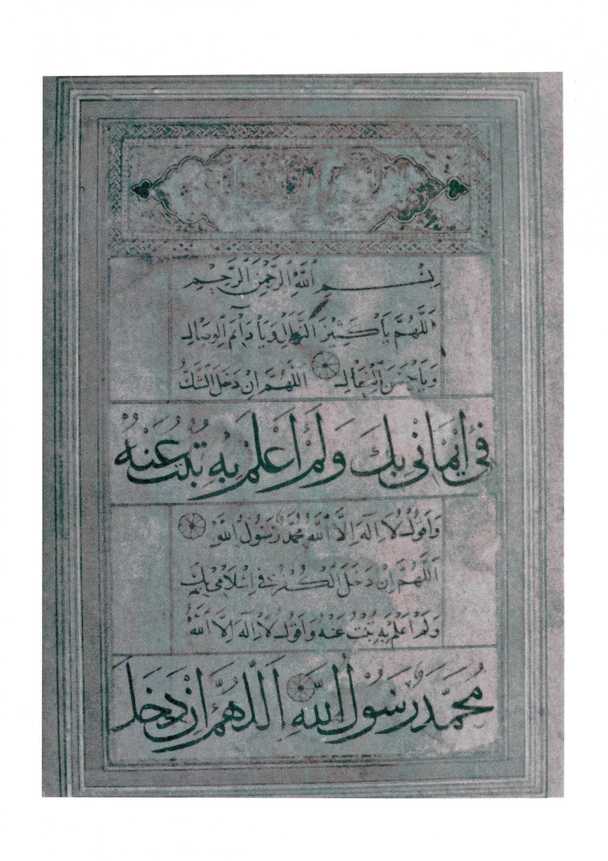تسع صفحات مكتوبة بخط ثلث ونسخ بديعيىن منسوبة للوزير ابن مقلة عميد حسن الخط العربي العراقي وفي العالم الإسلامي قاطبة وهذه المخطوطة الفريدة النادرة من مخلفات السيد عبدالوهاب صاحب الخط اللؤلؤي غفر الله له جد المرحوم ناجي زين الدين المصرف وقد أهديت لخزانة مكتبة المتحف العراقي ببغداد باسم -أحمد نيازي- ودون في خاتمة هذه الكراسة المنقطعة النظير من خط ابن مقلة- لقد تضمنت هذه الكراسة سطورا كتبت في التوبة والرجوع إلى الله تعالى وهي ظاهرة تذكرنا بما عاناه هذا